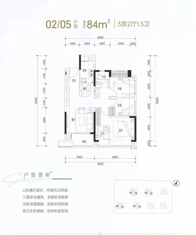 建面约84㎡是传统竖厅动静分区格局,客厅进深7.55米(不含阳台),开间3.4米,主卧8.4㎡(不含主卫和飘窗),空间确实会偏紧凑一点,但没什么硬伤,实用性还是非常不错的。