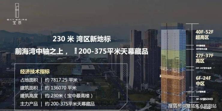 华侨城宝辰总高230米,为宝中最高楼;项目52层,分为中区、高区、超高区,6层起卖,11、39F为避难层,25-26F为空中会所,28F为空中大堂。除了空中大堂项目还有地下入库大堂+首层大堂,一共三重大堂。