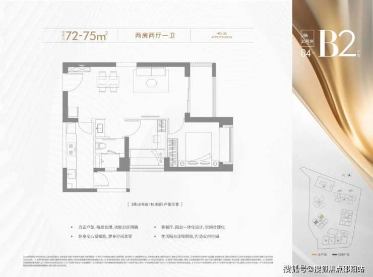 72-75㎡的2房2厅1卫,设计的是竖厅格局,客厅3.2米开间,LDKB一体化设计,进深7.2米,一字型厨房还带1个生活阳台,卫生间三段式分离,得房率约72.28%(不含赠送),西南、东南或东北朝向。