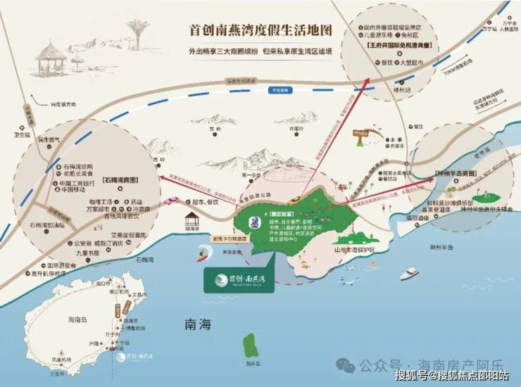 沿109公里海岸线分布的日月湾、石梅湾、南燕湾、神州半岛四大海湾,南燕湾位居其中心,近享威斯汀、艾美、君悦等豪华度假酒店、神州高尔夫、游艇码头等醇熟配套,又独享静谧的一线山海,远离喧嚣。