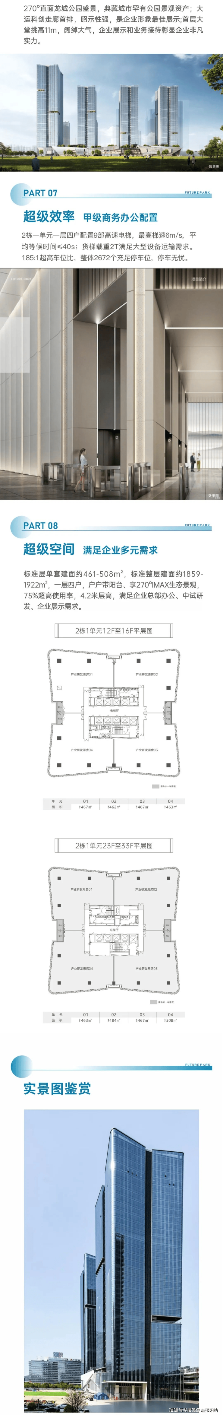 电梯:1栋一单元 16部高速电梯;1栋二单元和2栋一单元各9部高速电梯;货梯载重2T满足大型设备运输需求