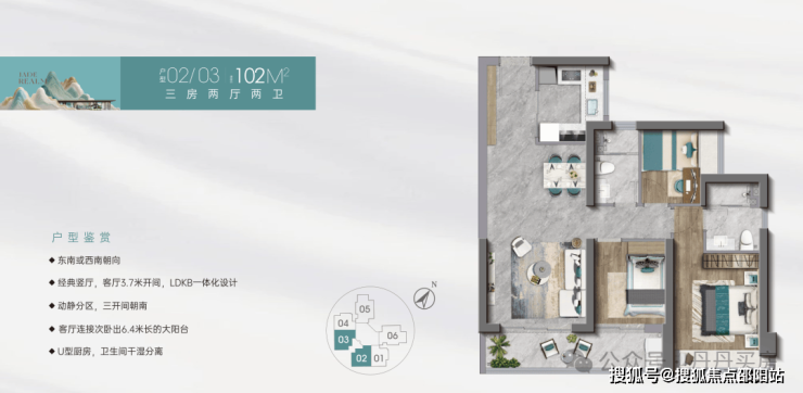 此户型为本次亮点产品,东南或西南朝向,经典竖厅设计,客厅3.7米开间,三开间朝南。客厅连接次卧出6.4米长的大阳台,为家庭休闲、茶叙提供理想空间。U型厨房操作流畅,卫生间干湿分离,主卧套房标配独立卫浴,完美契合改善型客户的核心需求。