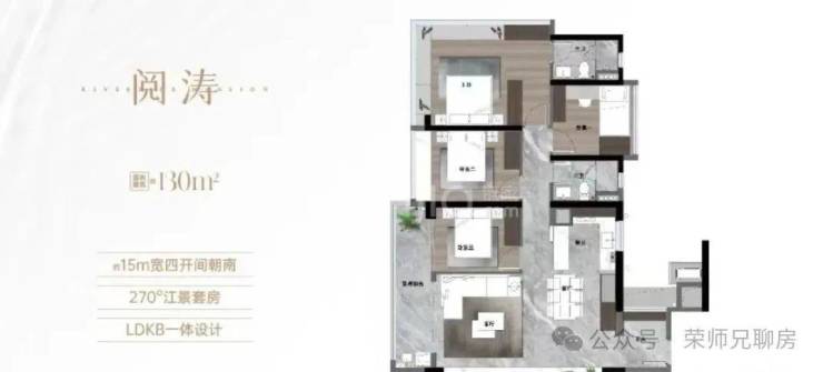 建面144平,只有6栋两条梯腿,总共82套,客厅与旁边灵动空间打通后,可以做到59平的阔绰空间,四开间约15米的南向采光面,南向视野与其它楼栋遮挡较少,这个户型10楼以上就能无遮挡望江了,单价3.9万起。