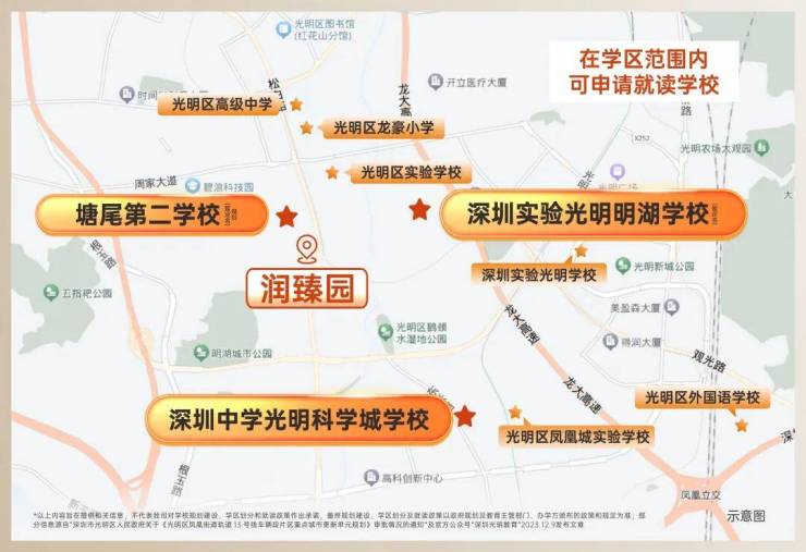 片区更新单元内规划了3所九年一贯制学校、7所幼儿园(信息来源:深圳市光明区城市更新和土地整备局),周边汇聚了深圳中学光明科学城学校、深圳市光明区实验学校等优质教育资源。