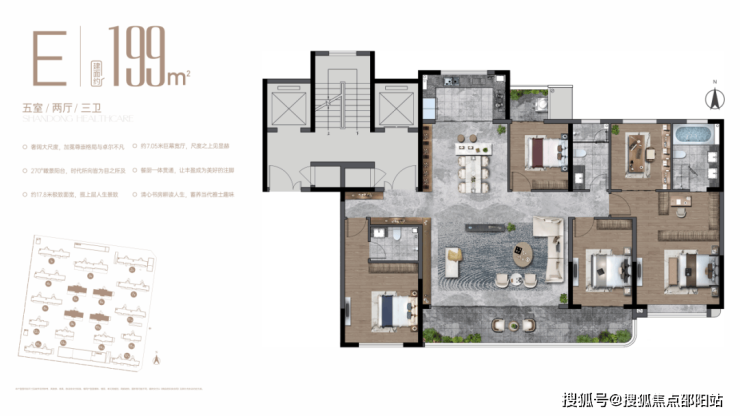 建面约199m²的户型更是把尊崇感直线拉满,五室两厅三卫格局。“约7.05米巨幕宽厅、270°瞰景阳台、约17.8米极致面宽”这不仅只是数字上的提升,更是空间质感上的飞跃。