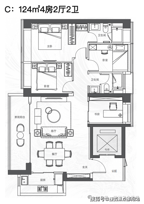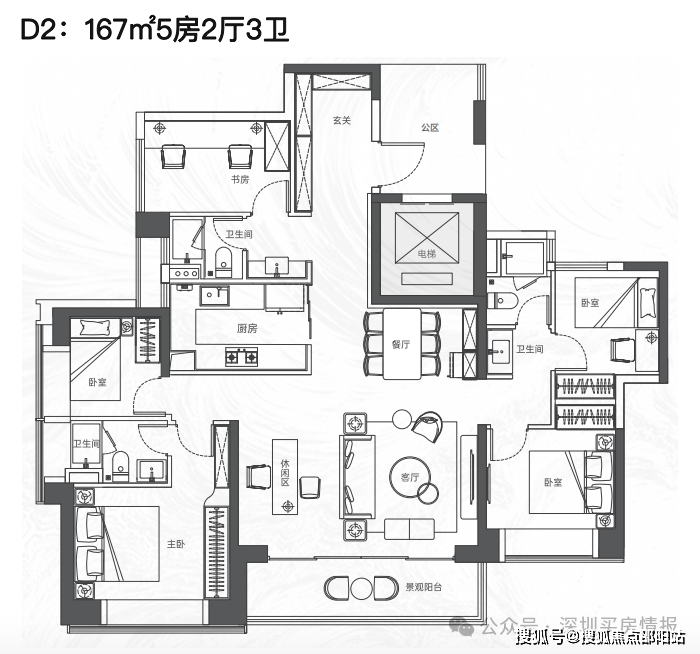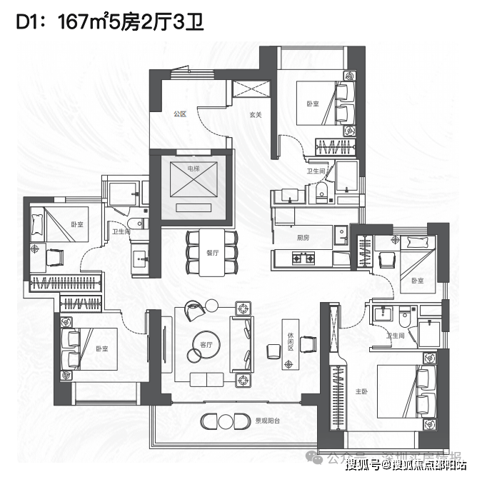 该项目将推出大约380套住宅,建筑规划包括2栋塔楼,其中高区采用4梯4户的设计,低区则为5梯5户,确保了每户都能享有独立电梯厅的配置。