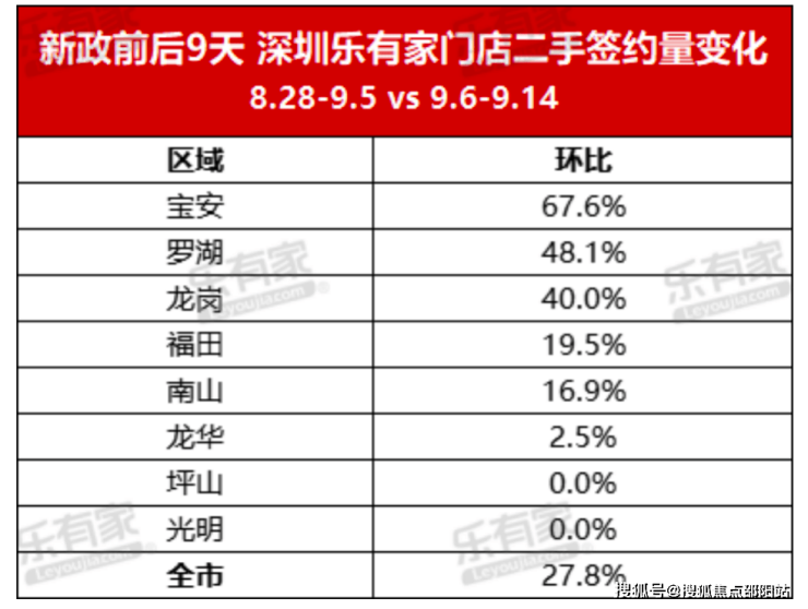 深圳乐有家研究中心数据显示,9月6日~9月14日期间,宝安的二手房签约量环比涨幅高达67.6%,而罗湖环比涨幅也达到了48.1%。