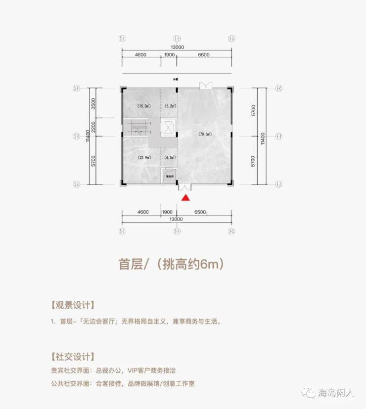 三层空间五个界面(顶层挑高约3m+首层挑高约6m+地下层挑高约6m)