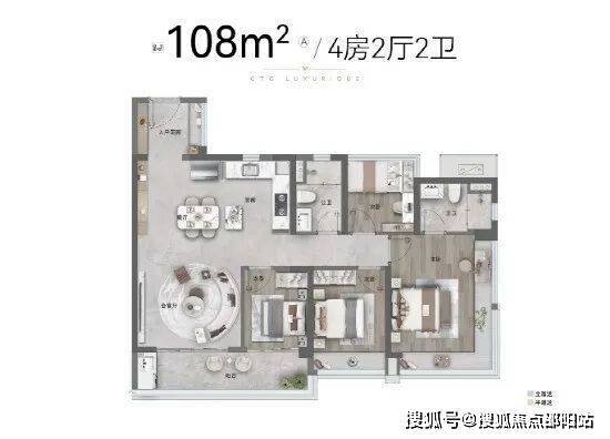 综合素质至能打的莫过于约108㎡户型,高得房率之外,兼具全屋高定交付标准,中央空调、精工厨房、齐全的收纳柜,基于生活的洞察将空间设计一步到位,对于二孩家庭实用性非常之高。