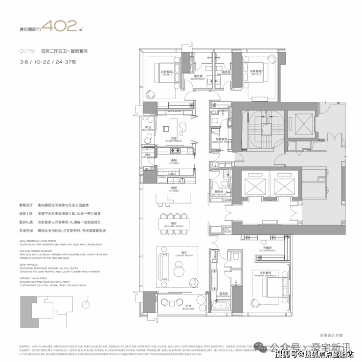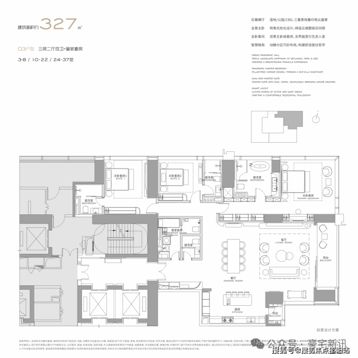 公寓主力户型为303㎡、326㎡、404㎡、572㎡等大平层,最大户型达1000㎡