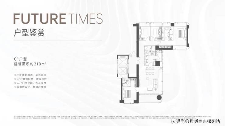 210平户型是双套房设计,配270度的景观大阳台,功能区动静分离。