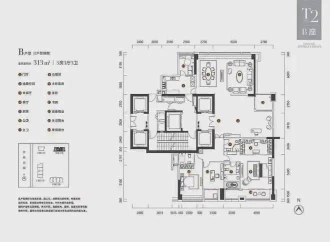 T2栋双梯入户 ,都有独立门厅,主佣分梯。亮点是超9m的横厅大开间景观面,客厅朝北,看深南大道景观,侧看中央公园;卧室全南向 ,看园林景观非常安静;动静分区,非常合理。