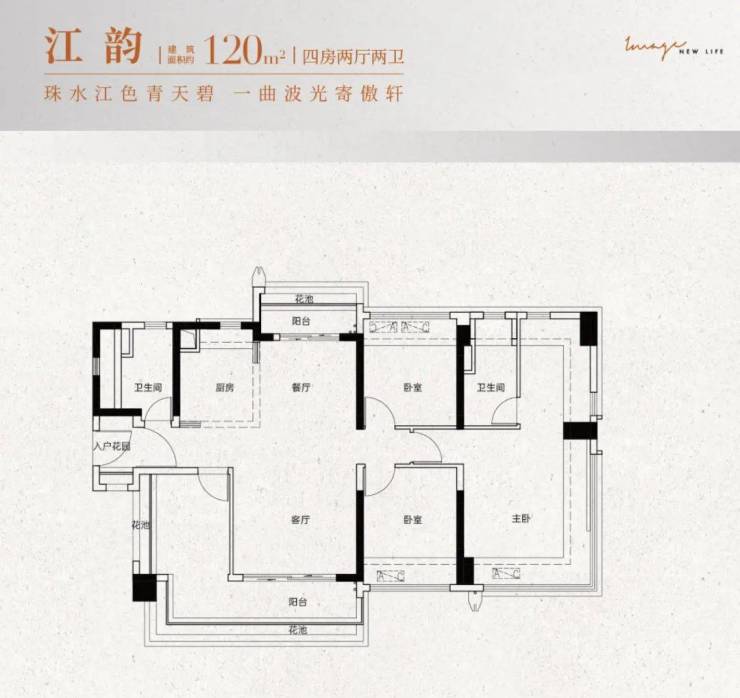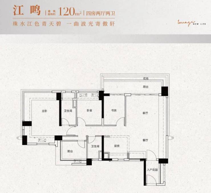 ②建面约120㎡:四房两厅两卫设计,共有2个户型可选,四开间朝南,居住与生活动静分离,南向大阳台或南北双阳台,主卧带270°飘窗