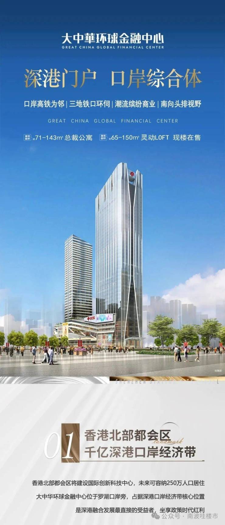 【大中华环球金融中心】紧贴罗湖口岸超级综合轨道交通枢纽,枢纽集铁路、城际、城轨、地铁、口岸于一体,搭配大中华环球金融中心停机坪,实现港深双城半小时生活圈,大湾区2小时商务圈。无缝连接香港商流、客流、人才、资本,多重利好叠加于此,实现片区腾飞。