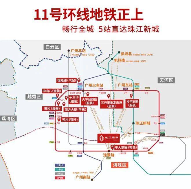 广州首条环线地铁11号线逸景路站正上,负一层与地铁站联通,连接天河、越秀、荔湾、白云和海珠中心五区,串联广州十大专业市场,5站直达珠江新城,预计2022年底通车,届时珠江壹號业主将畅享便捷出行。