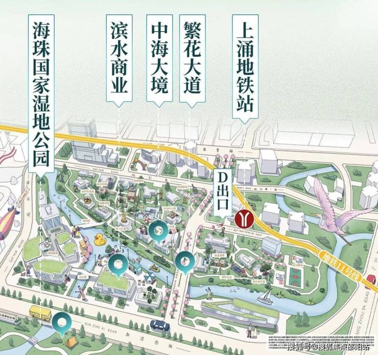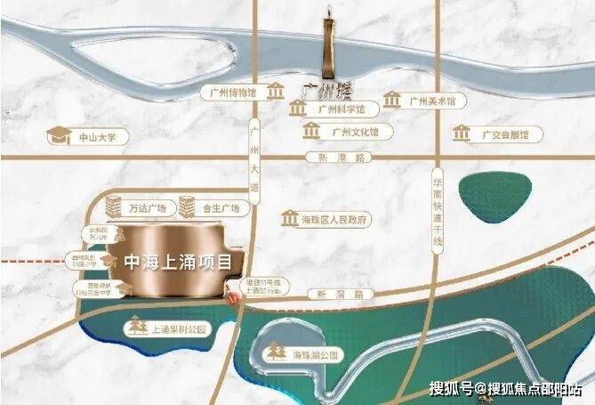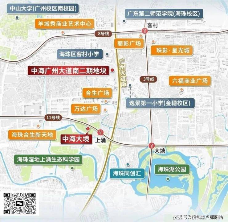 占位地铁 11 号线上涌站上盖,4 站直达珠江新城、琶洲,广州大道南与新滘西路双主干道环绕,出行高效。一路之隔即 1100 万㎡海珠国家湿地公园,享城芯稀缺生态资源。配建中大附属创新谷学校,全龄教育资源优质。
