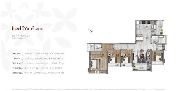 整个项目只有6栋楼,半围合式分布,45度“风车”户型联排,做到不同的户型的主要室内空间都朝南向排布,尤其卧室空间,几乎做到了100%朝南。
