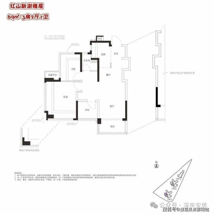 69㎡的3房2厅1卫,设计的是竖厅格局,客厅3米开间,LDKG+X空间一体化,S墙设计预留冰箱卡槽位,动静分区,三开间朝南,主卧+1个次卧都是双飘窗设计,次卧带1个设备平台放空调机位,U型厨房,卫生间三段式干湿分离,得房率:100%(包含赠送),西南朝向。