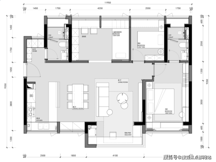 当双次卧全部打通与 LDKB (客餐厨阳台)一体联动时,整个空间豁然开朗,呈现出无法比拟的通透视野。想象一下:二人世界时,客厅、餐厅、阳台与双次卧连成 约25㎡的超大公区,进深甚至长达约8.5米,大平层的气场扑面而来;而二胎来临或三代同堂时,又能恢复为两间独立的功能空间作为儿童房使用。