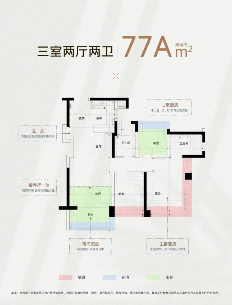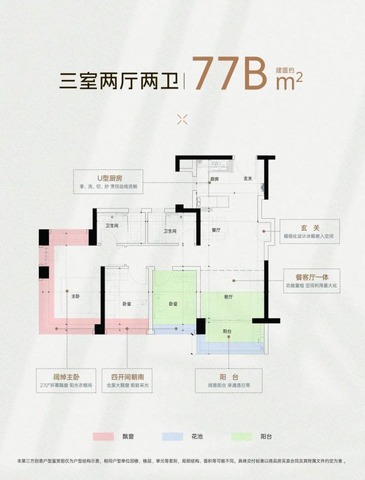 建面约77-135㎡三四房,四面宽南向,三房(最高)享约5米客厅,新规产品约127-137%高使用率,(但实际看了,感觉并没有宣传的那么高使用率)同面积不同户型,贴心打造多种人居空间。