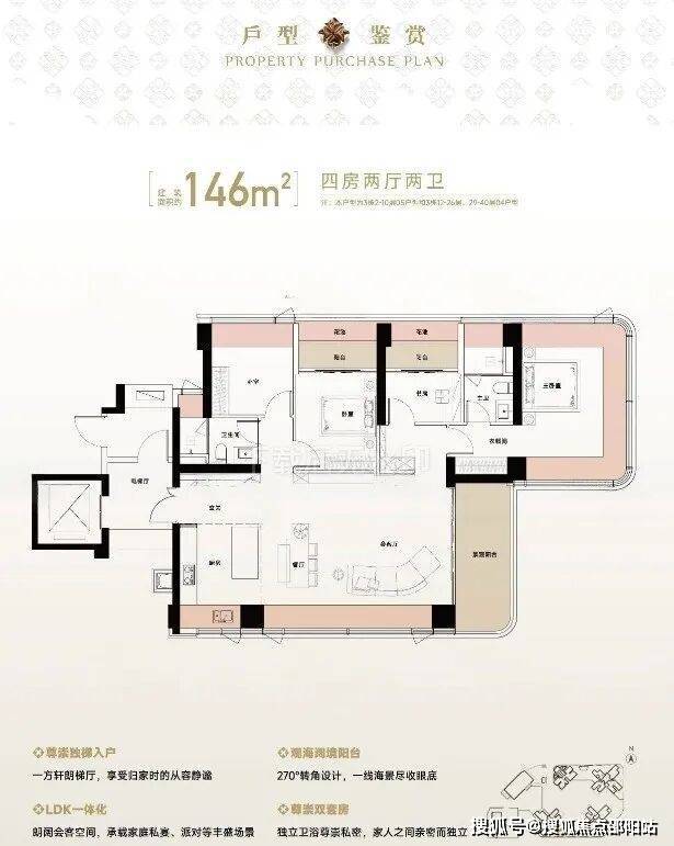 146㎡的4房2厅2卫,设计的是竖厅格局,尊享独立电梯入户,LDKB一体化设计,动静分区,主卧270°无柱转角全景舱,L型厨房+岛台设计,卫生间干湿分离,得房率约105%(包含赠送),东南朝向看海景景观。
