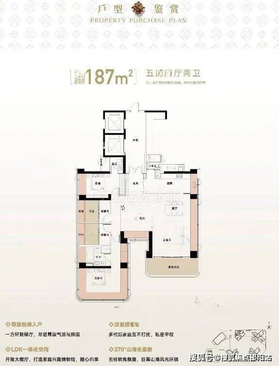 187㎡的5房2厅2卫,设计的是竖厅格局,尊享独立电梯入户,LDKB一体化设计,动静分区,三开间朝南,主卧270°无柱转角全景舱,L型厨房+岛台中西厨设计,公卫三段式干湿分离,得房率约111%(包含赠送),西南朝向看海景景观。