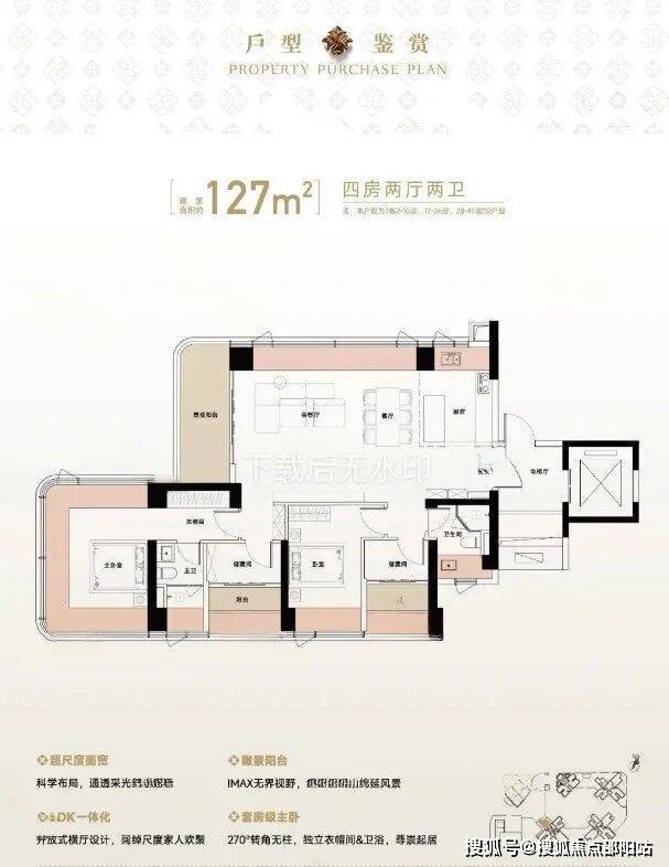 127㎡的4房2厅2卫,设计的是竖厅格局,尊享独立电梯入户,LDKB一体化设计,动静分区,六开间朝南,主卧270°无柱转角全景舱,L型厨房+岛台设计,卫生间干湿分离,得房率约105%(包含赠送),西北朝向看一线梧桐山景观。