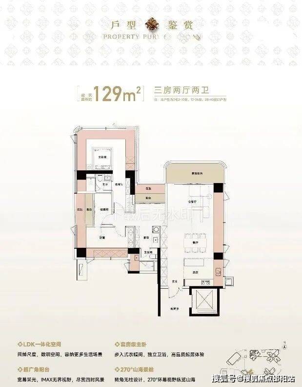 129㎡的4房2厅2卫,设计的是竖厅格局,尊享独立电梯入户,LDKB一体化设计,动静分区,主卧270°无柱转角全景舱,L型厨房+岛台设计,公卫三段式干湿分离,得房率约105%(包含赠送),东北朝向看一线梧桐山景观。