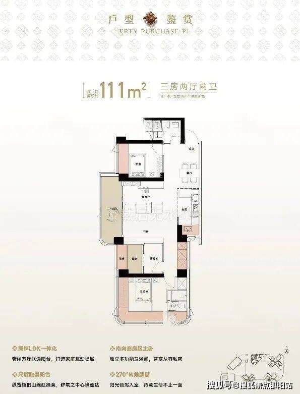 111㎡的3房2厅2卫,设计的是竖厅格局,LDK一体化设计,四开间朝南,主卧270°无柱转角全景舱,L型厨房,卫生间干湿分离,得房率约94%(包含赠送),西北朝向看一线梧桐山景观。