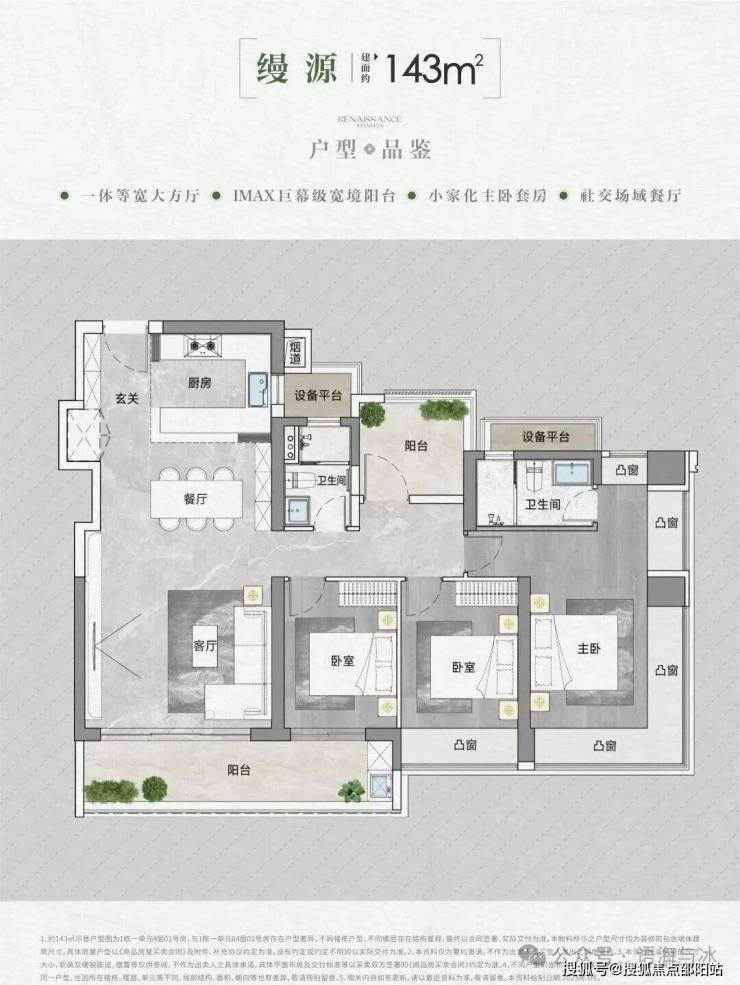 143㎡的4房2厅2卫,设计的是竖厅竖厅格局,进门入户玄关,超大宽面客厅,LDKB一体化,S墙设计预留冰箱卡槽位,四开间朝南,客厅连接次卧出巨幕大阳台,U型厨房,卫生间干湿分离,还带2个设备平台,得房率约96.14%(包含赠送),东南朝向。