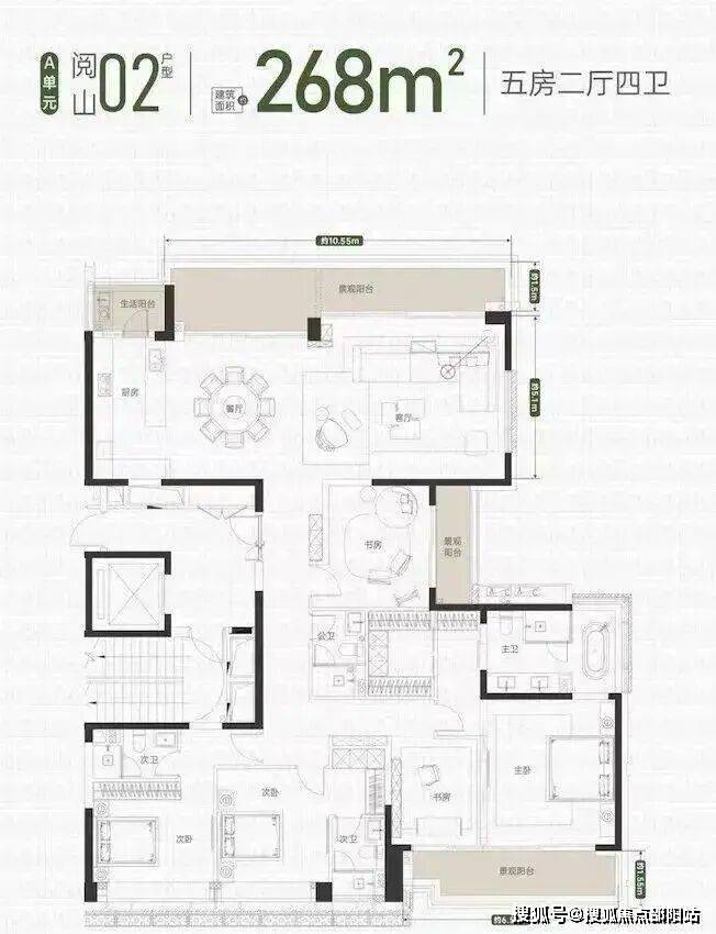 项目分两期开发,含4栋高层和10套商业别墅,共553户(含168户回迁)。主力户型为建面约120-260㎡住宅,另有193-268㎡大平层。朝向涵盖东南、西南、东北、西北。