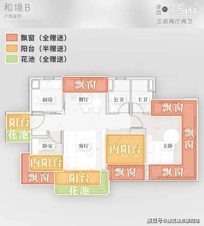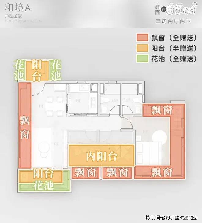再来看项目的主力户型——建面约85㎡南向三房,有横厅、竖厅两种设计。