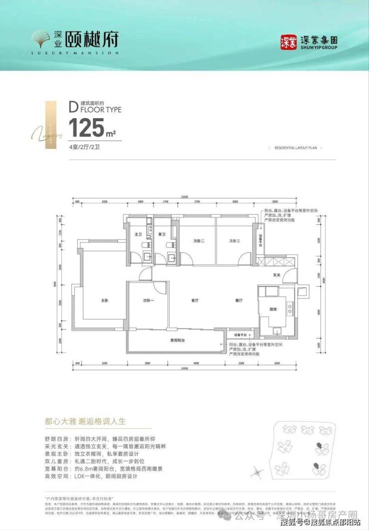深业颐樾府占地约2.6万㎡,总建面约18.65万㎡,计容建筑面积约14.1万㎡,容积率5.2,绿化率40.01%,共由7栋总高30-46F的住宅组成,其中1栋1单元企业自持租赁住房32F,1栋2单元公租房31F,1栋3单元公租房30F,2/3栋商品房32F,5栋商品房46F,6栋商品房45F,4栋是1所6班制幼儿园,以及部分底商和公交首末站等公共配套。 项目采用C型围合布局,外墙为铝板山墙+真石漆+涂料,2梯6户、3梯6户,户户朝南。