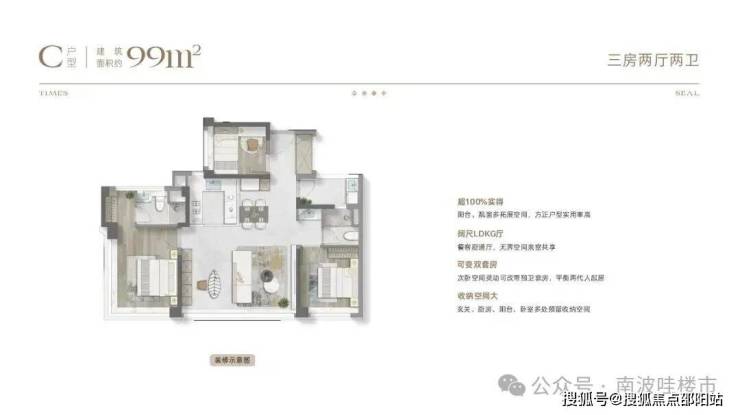 99㎡户型实现约102%实得率,创新采用270°转角阳台
