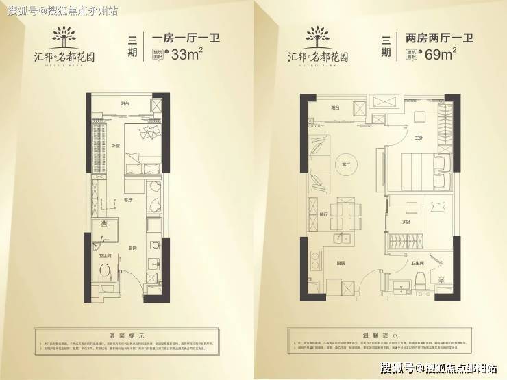 33㎡单房:功能分区明确,带阳台和开放式厨房,适合单身或小家庭。