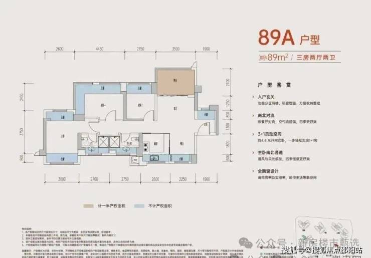 入户处比较宽敞,可以做鞋柜收纳,客餐厅南北对流,全飘窗设计,高得房率及使用率,主卧南北通透,通风和采光不错,套房设计,其中一个次卧可以改成1+1房。