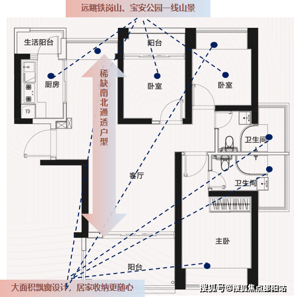 三阳台:前海黄金圈内,唯一在售89㎡三房两卫三阳台,客厅阳台进深2米,堪比140㎡大户型阳台