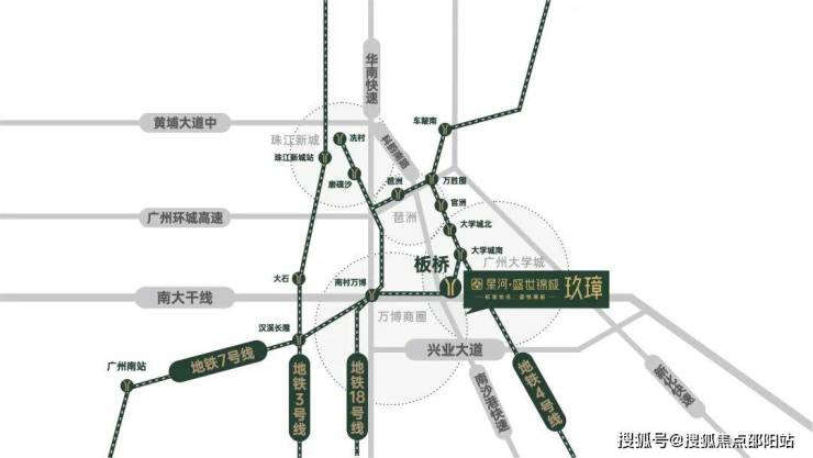 直线距离仅约500米可达板桥地铁站(百度地图测距),实现2站万博,1站大学城,5站到琶洲,6站珠江新城;