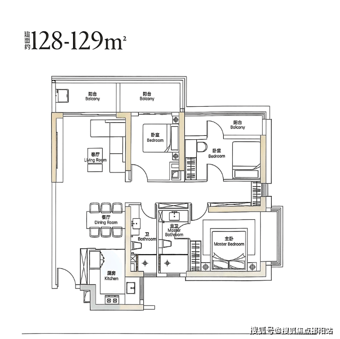 128㎡四房两卫,四个房间对立设计,做到了通风采光对流,厨房相对较小,实际样板房与户型图有差异。