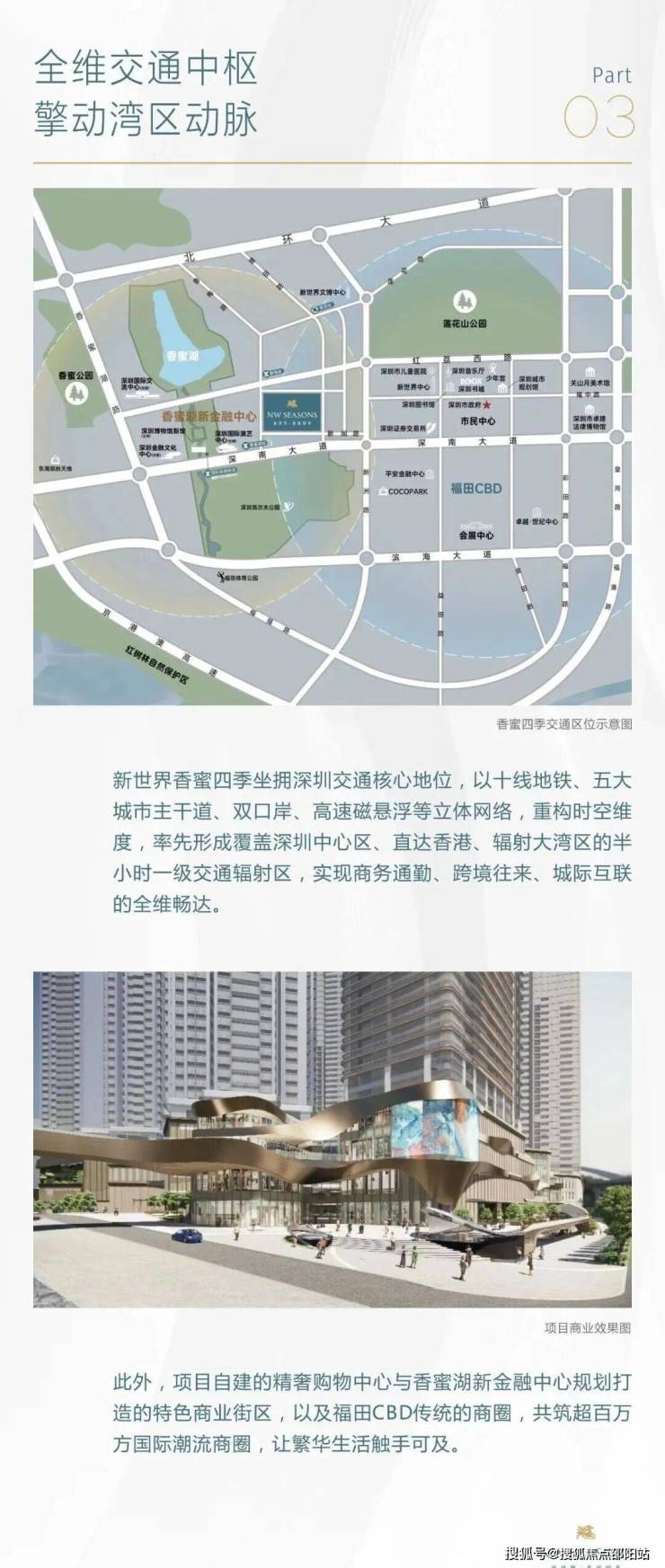 从区域位置来看,该项目位于香蜜湖、车公庙与福田 CBD 三大核心功能区的交汇地带,周边集聚福田区顶级城市配套资源,且与规划建设中的香蜜湖新金融中心仅一路之隔,区位优势显著。