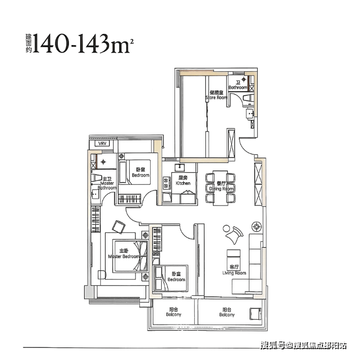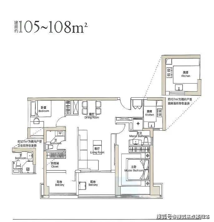 105㎡三房两卫采用房间左右侧设计,传统说法双龙抱珠,基本没有浪费空间,户型拓展率大,阳台以实体样板房为准;
