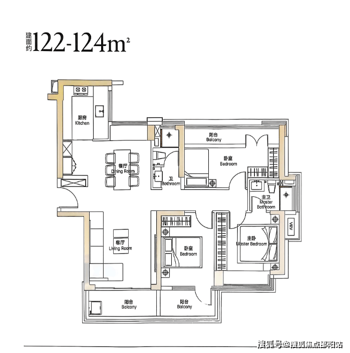 123㎡四房两厅户型,传统中规中矩户型,与122㎡进门口与厨房方位不一致,均采用双阳台设计;