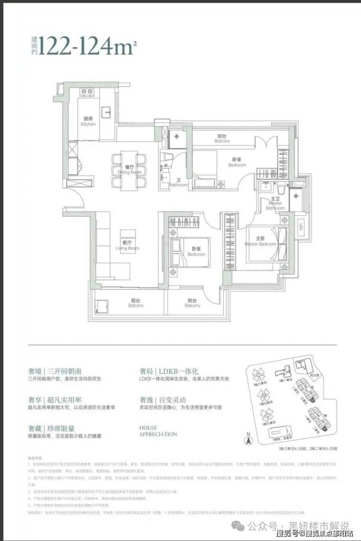 其中住宅20.3万㎡(含保障房1.5万㎡)、商务公寓3万㎡、商业5万㎡,以及配建有幼儿园和图书馆等市政生活配套。可售总套数约923套,面积约105-280㎡3-6房,还有少量顶楼复式。套内建面小于90㎡的有736套,占比79.74%,回迁面积为70-95㎡2-3房。