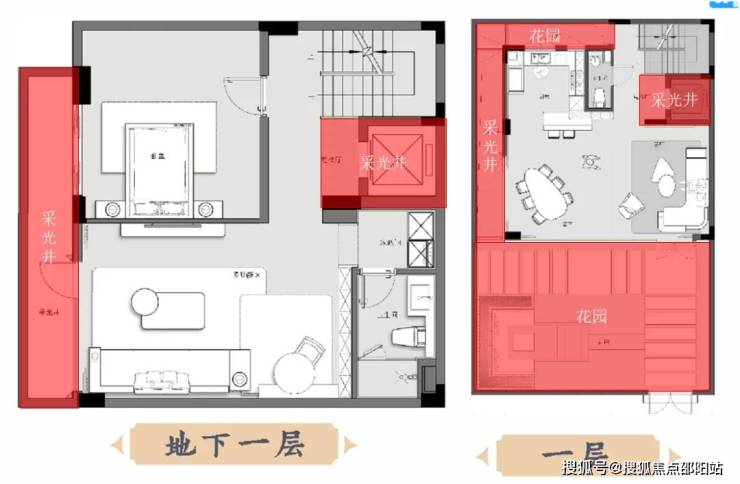 部分戶型規劃為下沉式庭院,打造雙層院落,以及配有前後花園,有天有地,舒適生活由此起。