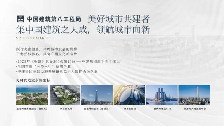 中建海丝城:作为中建八局倾力打造的首个央地合作项目,以大盘造城理念共筑未来城市,打造一个立于珠江之畔,海丝明珠的理想生活新世界。