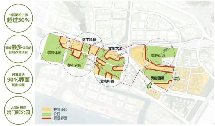 结合本土文化内涵塑造9个特色主题公园:海丝科技公园、都市农田公园、岭南艺境公园、沙浦国学公园、城市塑影公园、缤纷童趣公园、龙舟生态公园、远洋文化公园、桥畔运动公园。