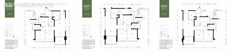 89㎡-3房2厅2卫,设计的是经典竖厅格局,客厅3.4米开间,三开间朝南,3个卧室分别是3米/2.8米/2.4米的宽度,L型厨房,得房率:75.42%(不含赠送),02-03户型是东南朝向,05.06户型是西南朝向。