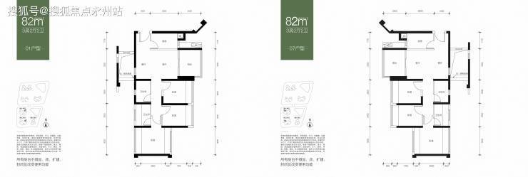 82㎡-3房2厅2卫,设计的是竖厅南北通透格局,客厅3.3米开间,3个卧室分别是3米/2.6米/2.4米的宽度,主卧南北通透设计,L型厨房,得房率:75.42%(不含赠送),01户型是西北朝向,07户型是东北朝向。
