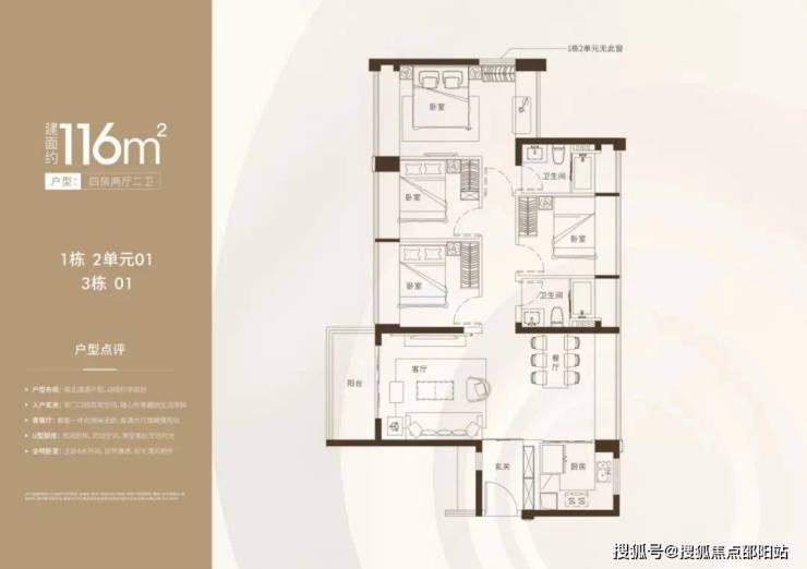 建筑面积约116㎡户型通透户型,大开间短进深,通风采光性能良好;四个面宽朝南;主要生活空间日照充足;客厅带有大型景观阳台,主卧双面采光宽敞明亮;三次卧空间均衡功能全面;餐厨空间宽敞舒适,独立通风采光;入户玄关自然通风采光,可提供良好功能空间。