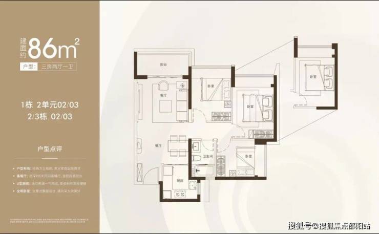 户型动静分区布局,空间配置科学合理,紧凑实用;朝向特点鲜明,1栋2单元花园景观兼顾安静,2栋无遮挡公园景观,3栋开阔城市景观;主要生活空间通风采光性能良好,客厅带有大进深阳台;卧室空间分配均衡,开间进深比良好,空间利用充分;餐厨空间紧凑实用,U型厨房实用性能良好,自然通风采光;入户自带玄关,尺度合理。